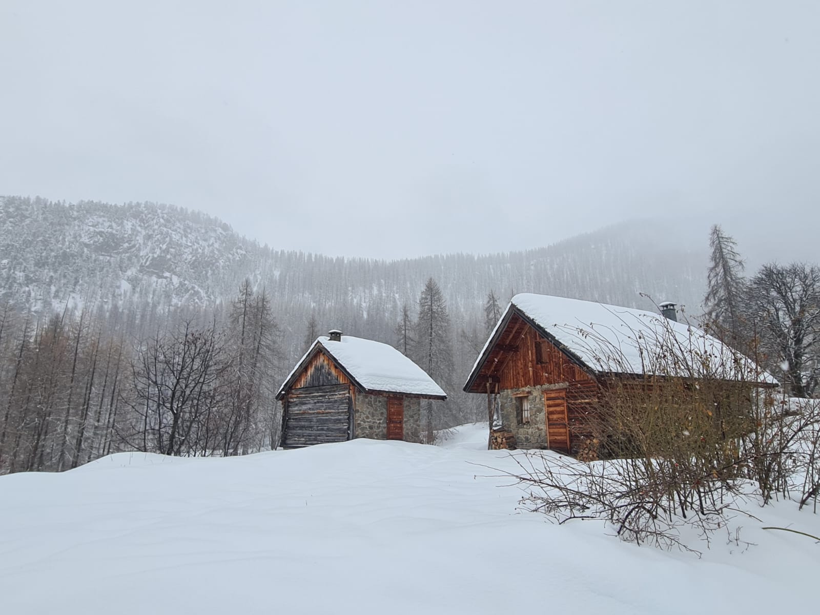 Objectif du jour : rejoindre le hameau d’alpage de Peynin, perché dans un décor de carte postale. Ces chalets traditionnels en pierre et bois servaient autrefois de refuge aux bergers et sont aujourd’hui réaménagés en hébergements rustiques, souvent avec cheminée, dortoirs douillets et vue spectaculaire. C’est là qu’on posera nos sacs pour la nuit et qu’on pourra faire la fête pour le passage à la nouvelle année.