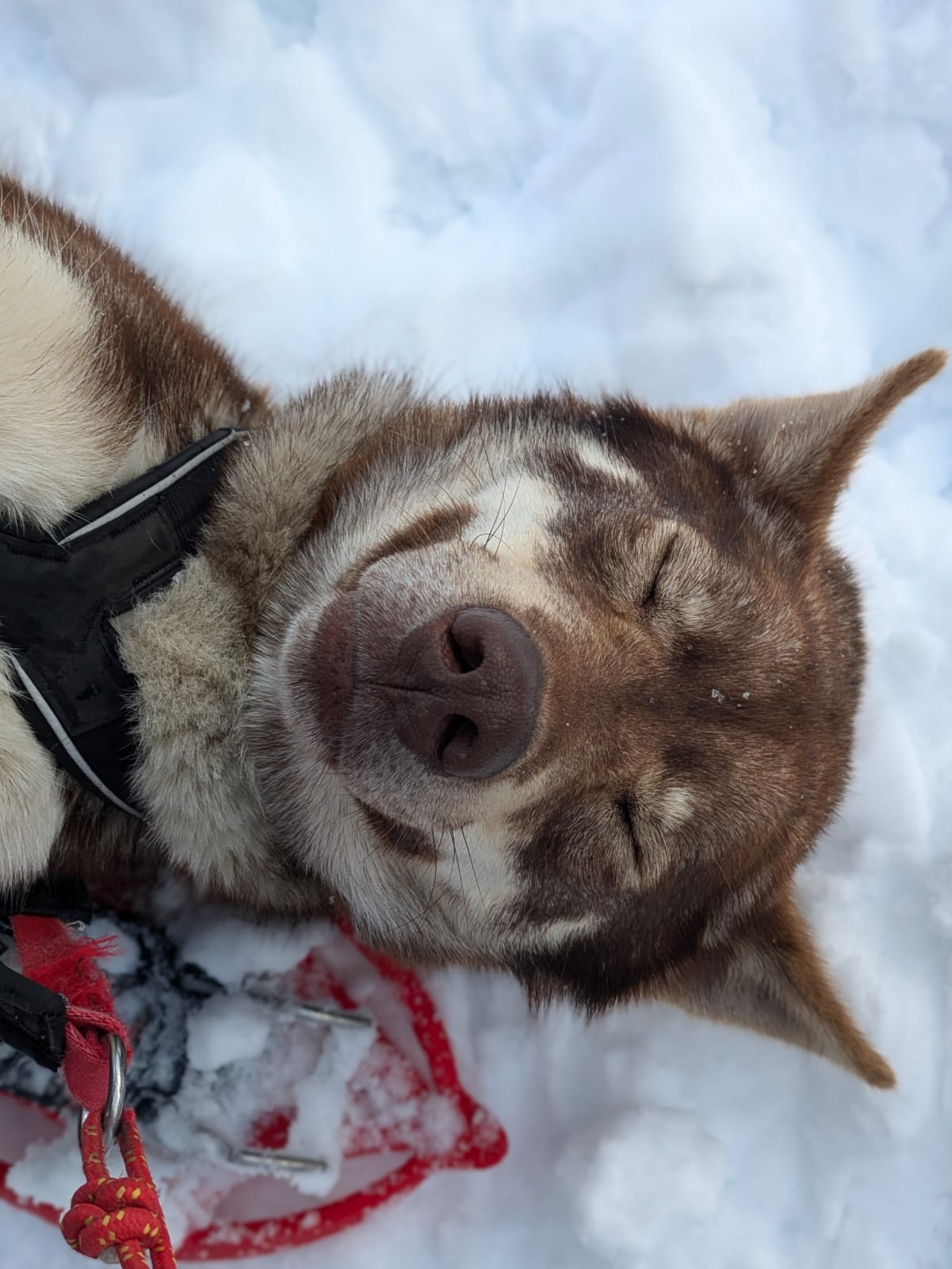 Ce matin, on part pour une journée complète de cani-randonnée raquettes. Chacun se voit confier son compagnon à quatre pattes pour les deux prochains jours. Ensemble, on avance, on s’encourage, on apprend à se comprendre. Certains tireront une pulka, d’autres seront directement tractés par leur chien : dans tous les cas, on forme une belle équipe !