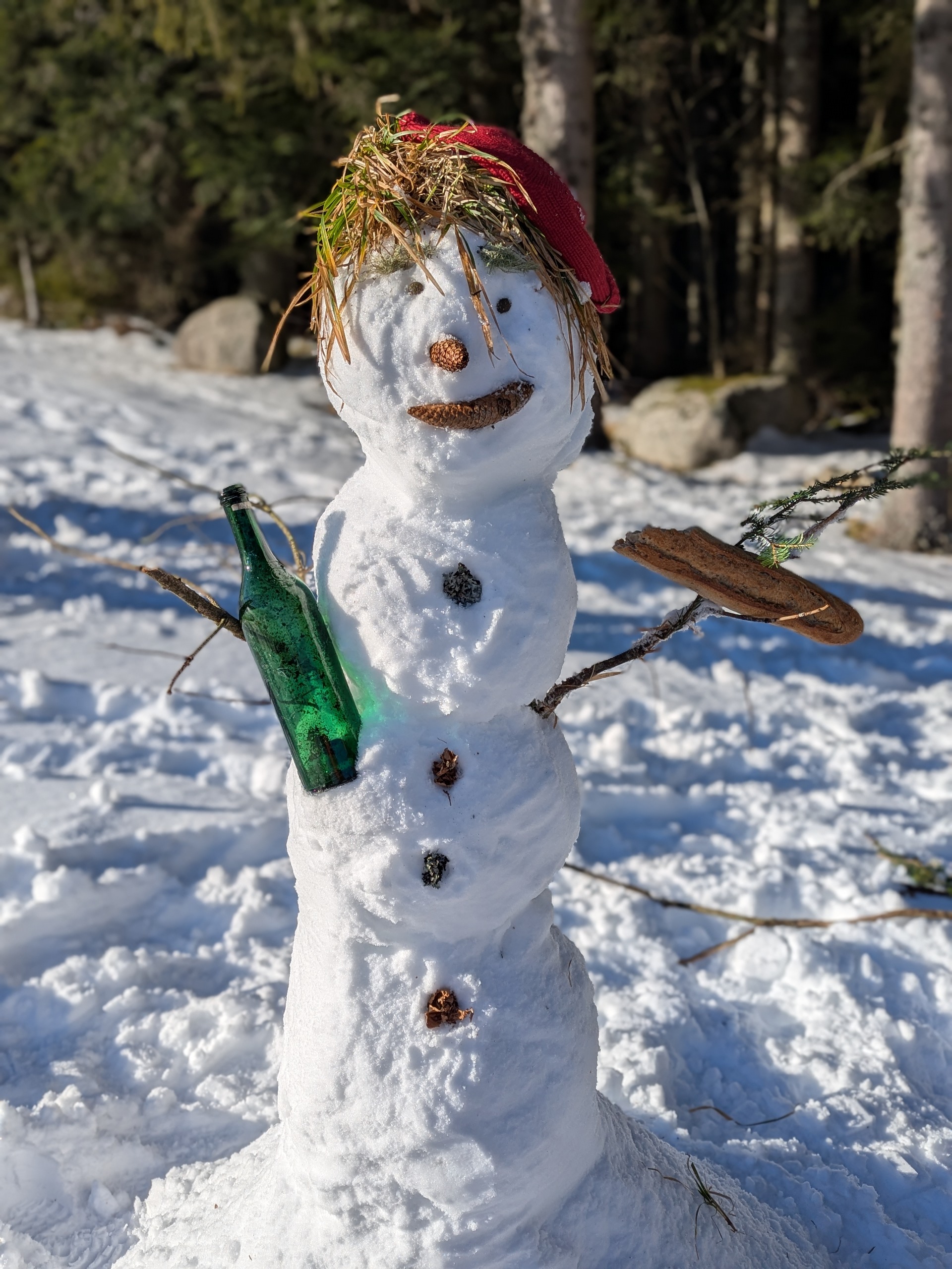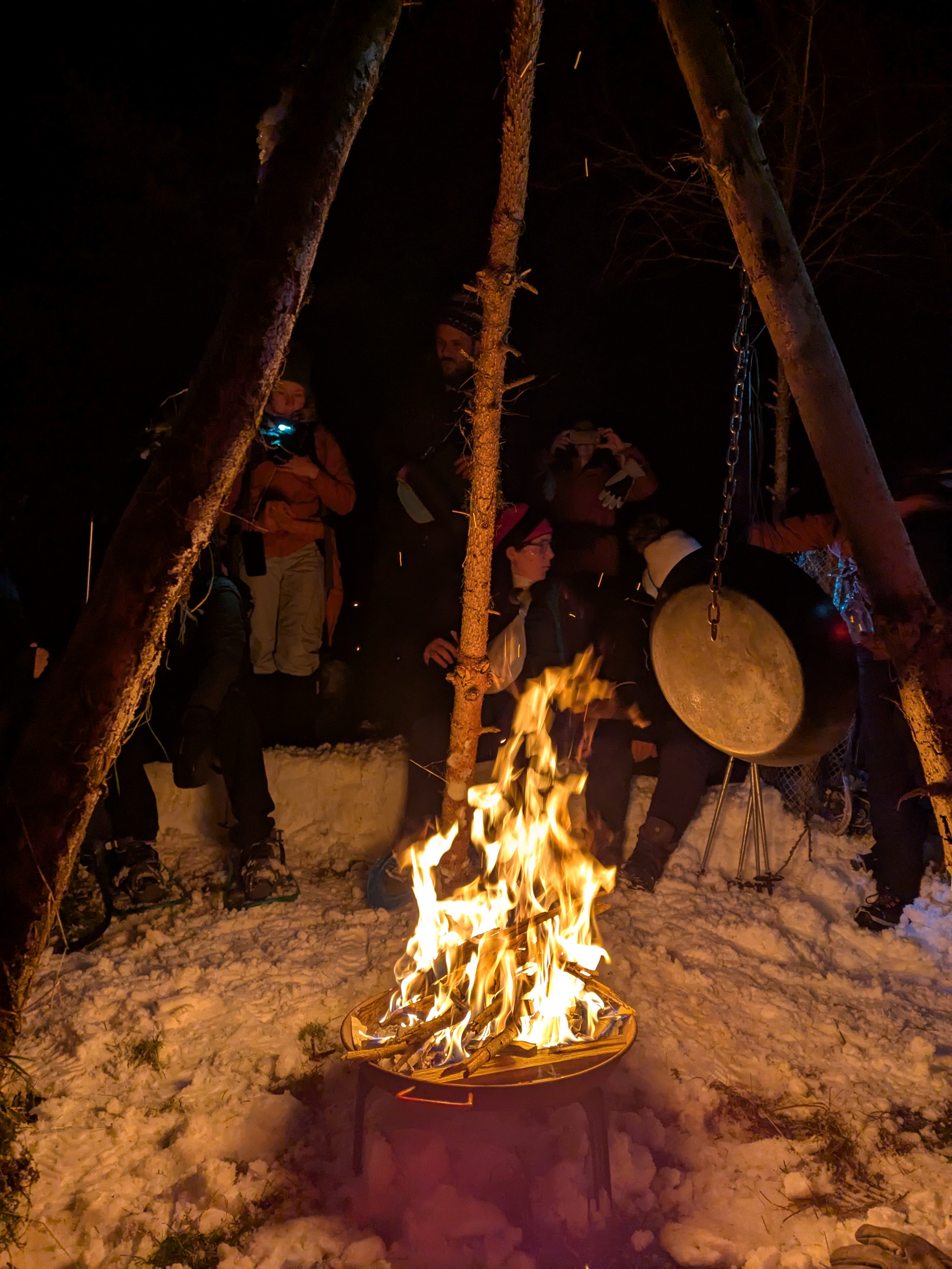 Bières, dégustation de vin, spaetzles, saumon fumé, goulash et gâteaux, nous aurons droit à tout ! Nous préparons un feu de camp dans la neige pour y réchauffer le dîner dans une marmite en fonte, que nous dégustons sous les étoiles. À minuit, nous trinquons au crémant d’Alsace pour célébrer le passage à la nouvelle année ! BONNE ANNÉE ! 🎉