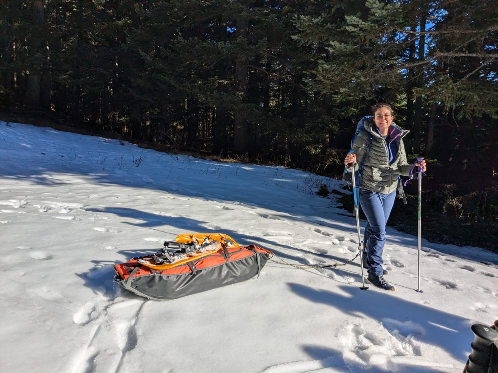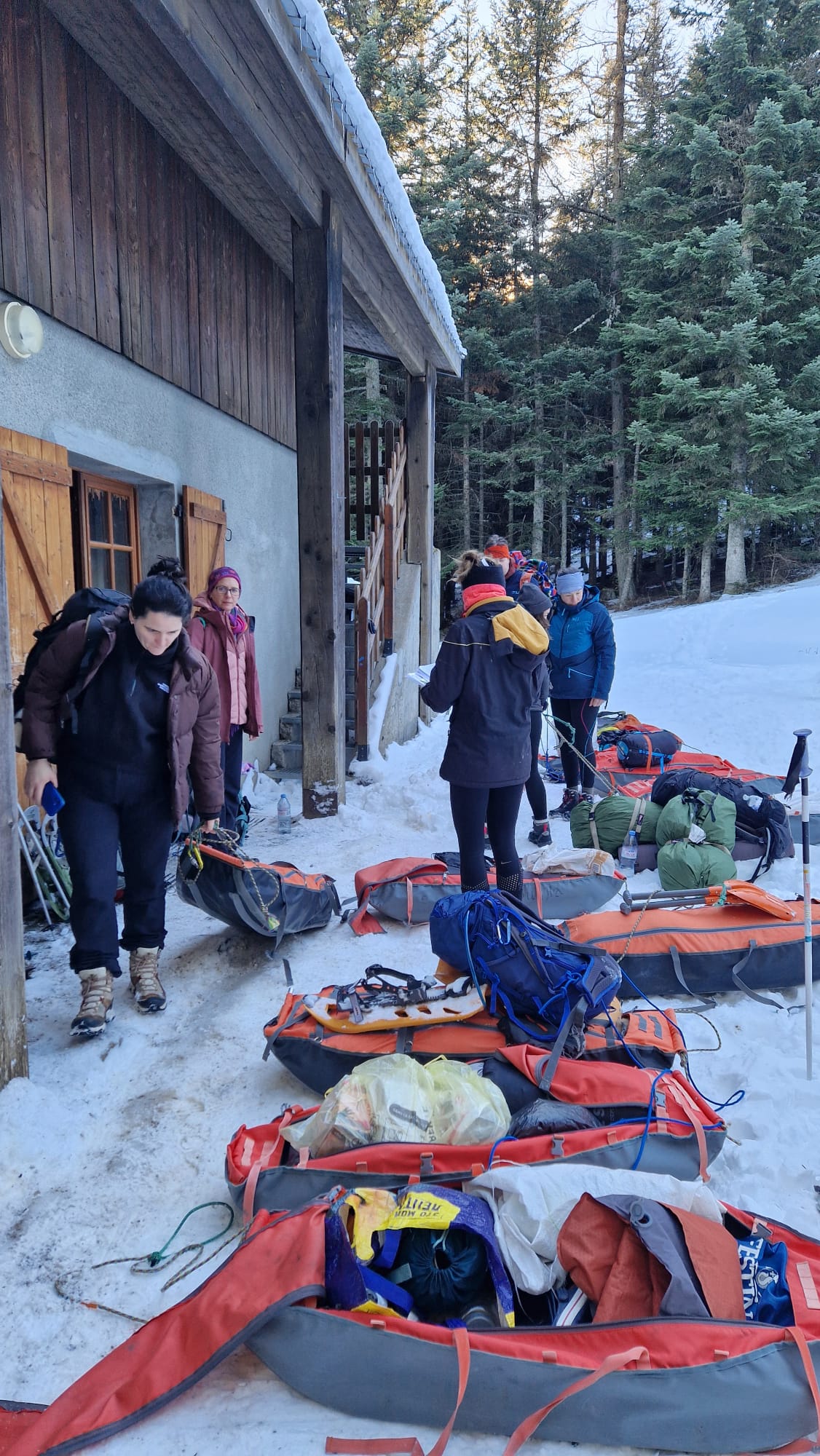 Nous avons rendez-vous à 11h30 à la gare de Grenoble pour rencontrer Captain Damien et le reste de l’équipe. Un transfert en mini-van nous conduit jusqu’aux contreforts du Dévoluy, une région méconnue et préservée des foules. Après le briefing, nous nous répartissons le matériel dans les sacs et les pulkas avant de nous lancer dans notre trek à travers la forêt. Nous prenons le temps de nous familiariser avec la manipulation des pulkas, puis nous nous enfonçons dans la montagne, laissant derrière nous les derniers villages.