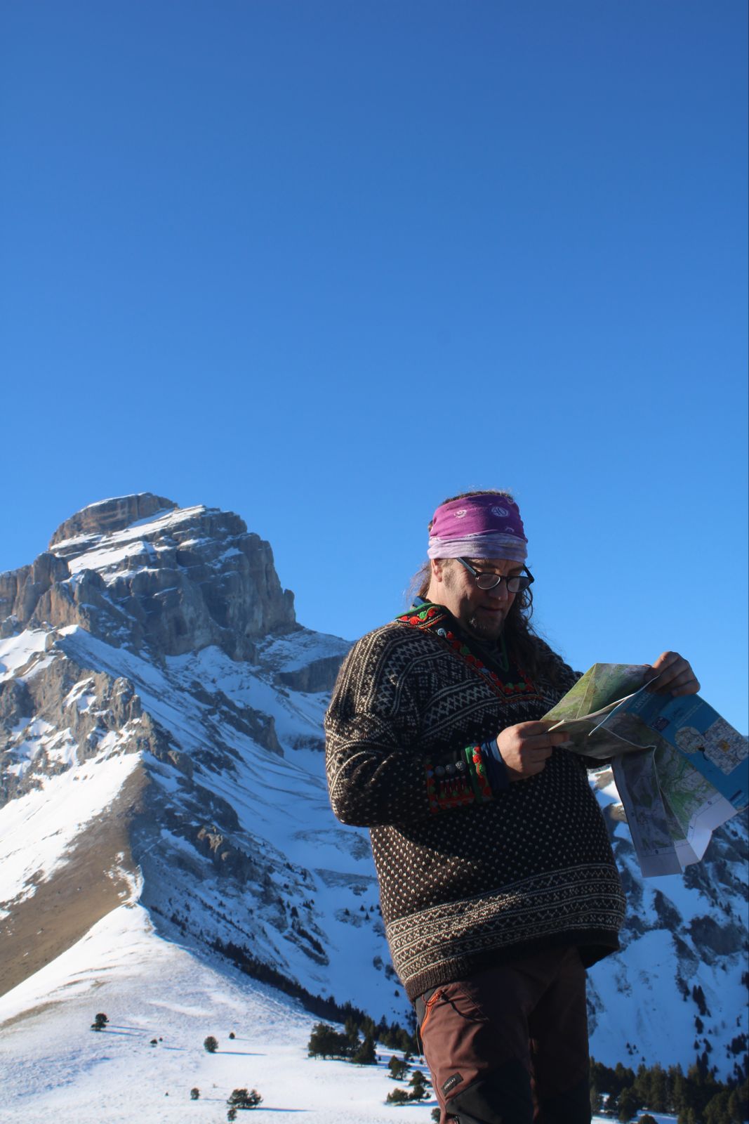 Notre objectif est l’Obiou, dont le sommet culmine à 2789m d’altitude. Pour diviser le trajet, nous passons la première nuit en bivouac hivernal, car la cabane que nous visons est encore loin dans la montagne. Nous établissons notre camp de base dans la Combe du Loup, à 1400m d’altitude.
