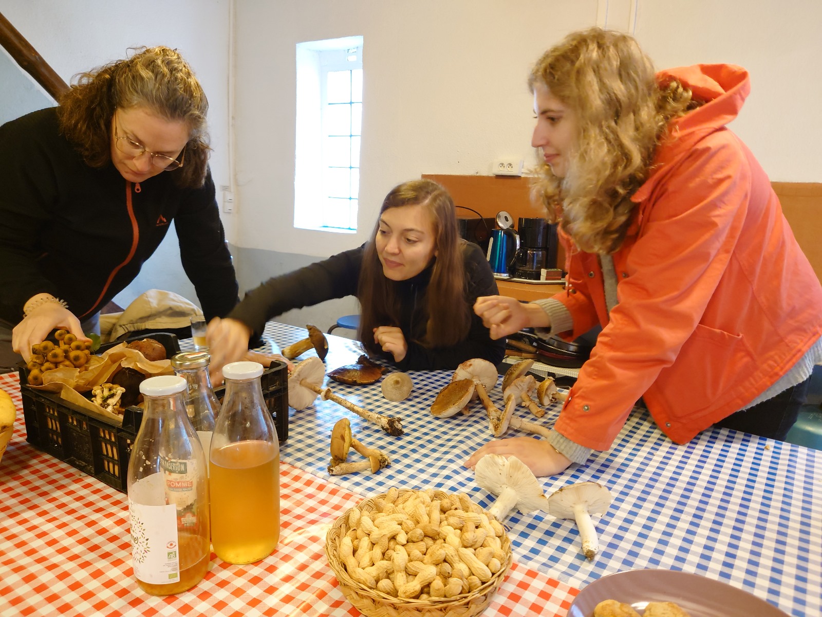 On se réveille dans le calme de la campagne, et après un bon petit-déjeuner, nous voilà repartis pour une journée champignons ! Nous passons la matinée en forêt pour une deuxième cueillette, forts des apprentissages de la veille. Nous faisons une halte pour partager le pique-nique tous ensemble, dans la forêt.
